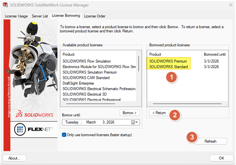 <Start→ SOLIDWORKS Tools <Version> → SolidNetWork License Manager Client <Version - בלשונית License Borrowing: