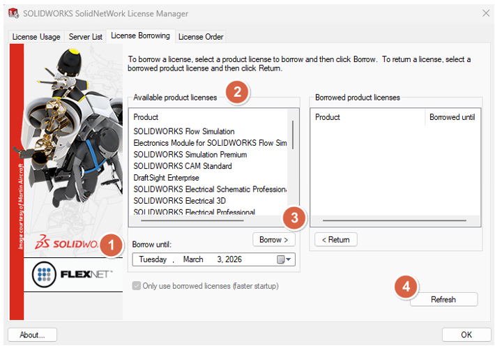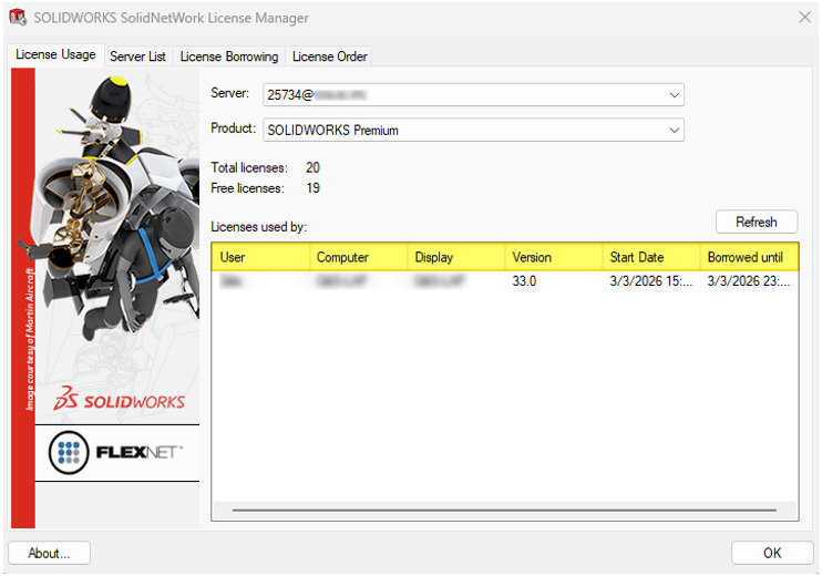 <Start → SOLIDWORKS Tools <Version> → SolidNetWork License Manager Client <Version - בלשונית License Borrowing: